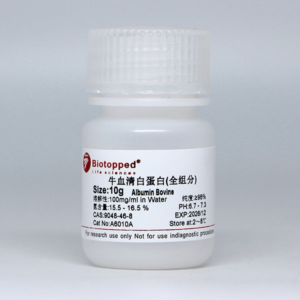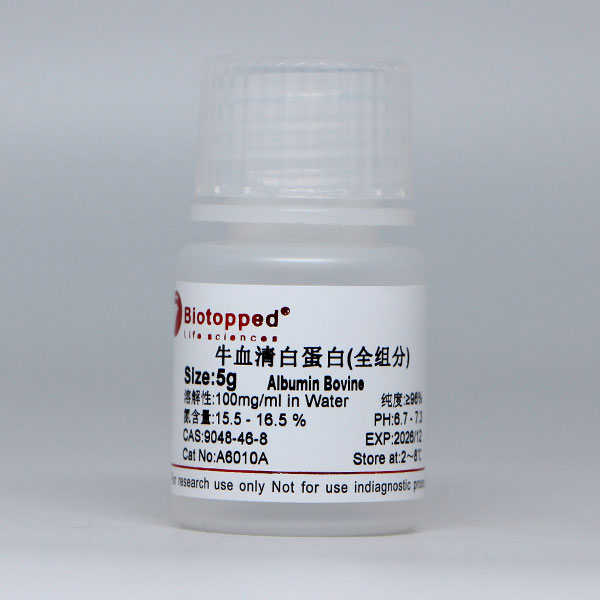 物理性状:白色至微黄色干粉或结晶;溶于水,溶解后由澄清变为略微浑浊,颜色由浅黄色变为黄绿色,参考浓度为40 mg/mL。 用途:生化试剂,蛋白质及衍生物。遗传工程和医药研究,用作胎酶和其他蛋白质的稳定剂,蛋白质标准。 牛血清白蛋白,英文名称为Bovine Serum Albumin,也称Bovine albumin,或Cohn Fraction V,简称BSA。BSA有着极其广泛的实验室应用,在免疫实验中常用作封闭剂,包括ELISA、WB(Western Blot)。作为载体蛋白,将其交联于半抗原和其他弱抗原可以使它们在抗体生产中具有更强的免疫原性。在限制性内切酶消化反应中,BSA常常被用作一些酶的反应稳定剂,并且能防止它粘附到管壁和枪头上。BSA也常用于生物制药的生产过程或者作为营养物用于细胞和微生物培养。除此之外,还作为蛋白定量检测的标准品使用。我们提供的BSA产品,使用优质牛血浆,利用热休克法(Heat Shock)法制备而成。 本级别的牛血清白蛋白(BSA, Standard Grade),可以满足大部分常规实验需求,如用作免疫封闭剂、组织细胞培养添加剂、蛋白/酶稳定剂以及蛋白定量标准品。 除了BSA-全,我司还提供其他应用级别的BSA,包括BSA-V,无脂肪酸,细胞培养级,BSA标准品,BSA封闭液。