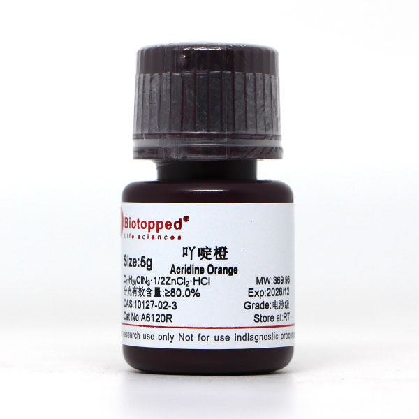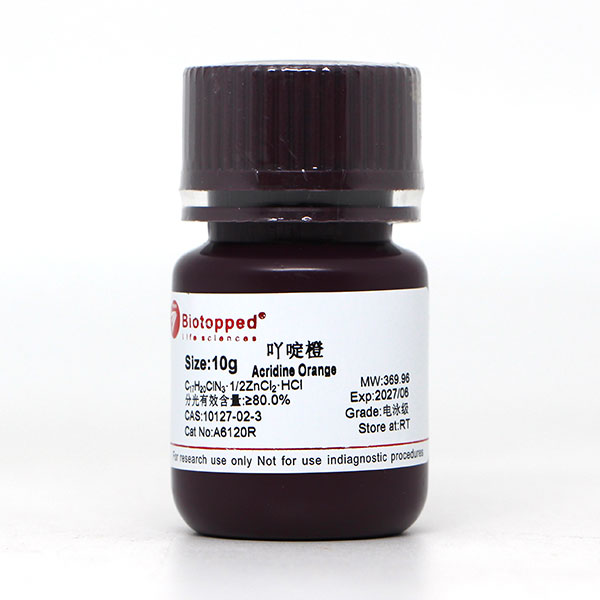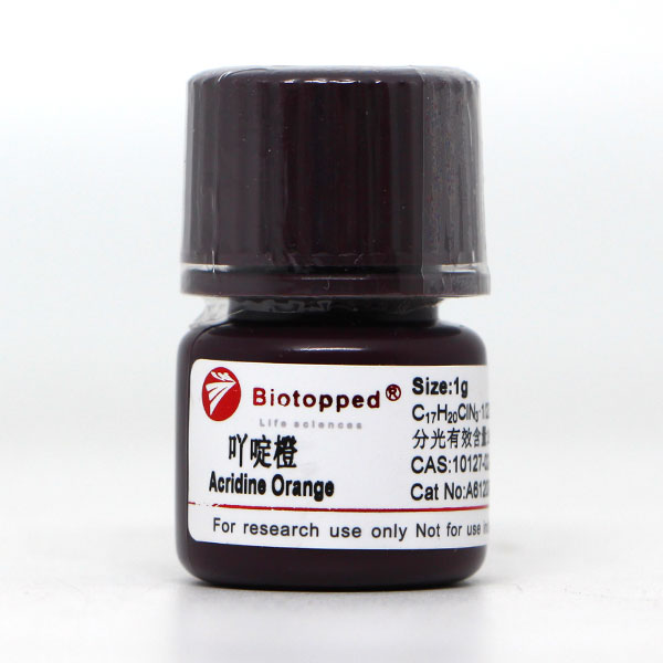 用途:本品仅供科研,不得用于其它用途。(以下用途仅供参考)肿瘤细胞和细菌、核酸染色剂及移码突变的诱变剂。荧光指示剂。吖啶橙是一种荧光色素,吖啶橙激发滤光片波长488nm。阻断滤光片波长515nm。吖啶橙与细胞中DNARNA结合量存在差别,可发出不同颜色的荧光(即着色特异性)