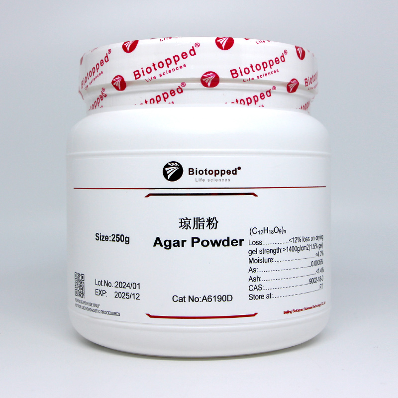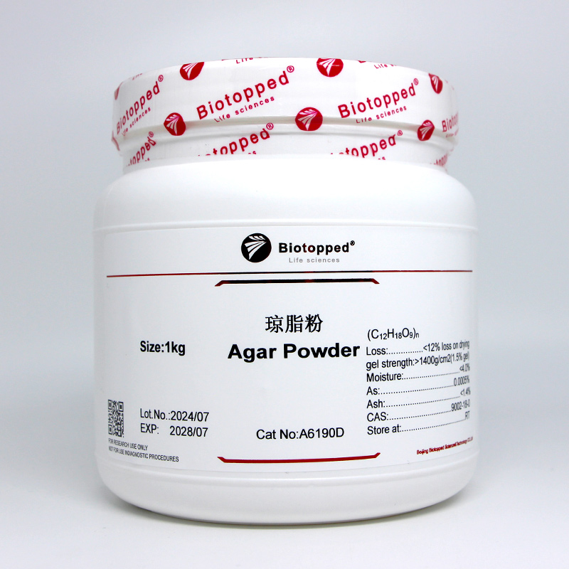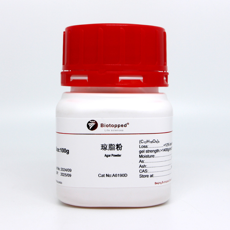 琼脂粉是由琼脂糖(agarose)和琼脂果胶(agaropectin)组成的,溶解性是琼脂粉不溶于冷水,易溶于沸水,缓溶于热水。检测凝胶强度为1.5%琼脂粉溶液在20摄氏度凝固后,能够表面不破承受的最大压强是1400g/cm2 在生物学实验中,微生物培养基、植物组培培养基常规添加琼脂粉的用量1.5-2% (工作浓度4-5g/L )。当实验中遇到琼脂粉不凝固时,常规的检测方法时pH值,浓度,温度,充分混匀等情况。