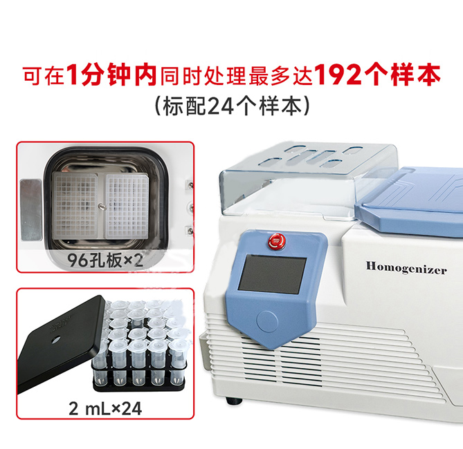 产品介绍: BWE-FP是一款全新升级的低温型研磨仪,仓内温度可达-50℃,并且拥有低温冻台。通过垂直震荡系统高速往复运动,使研磨管内冷冻的样品与研磨珠相互碰撞,其产生的研磨剪切力和撞击力使组织完全破碎,最多可在一分钟内同时处理192个样本,是满足多样品一次性快速处理的专用设备。