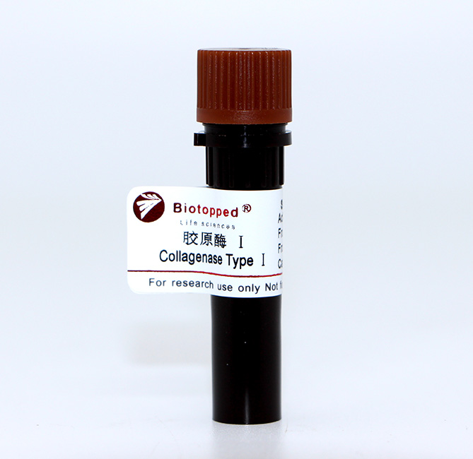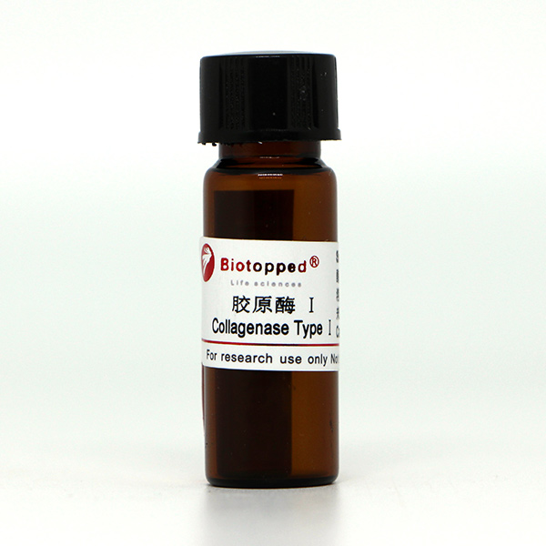 胶原酶Ⅰ为粗品,用于上皮、肺和肾上腺组织细胞的分离。外观为黑棕色粉末。分子量68,000 到125,000,最适PH为6.3-8.8。胶原酶能够特异性结合-R-Pro-8-X-Gly-Pro-R-序列中的中性氨基酸(X) 和甘氨酸之间的肽键。该粗品是溶组织梭菌分泌的混合酶。主要为胶原酶、中性蛋白酶和梭菌蛋白 酶。其中梭菌蛋白酶是被氧化的、最不活泼的酶,组织的分离必须依靠胶原酶和中性蛋白酶两者共 同作用。
