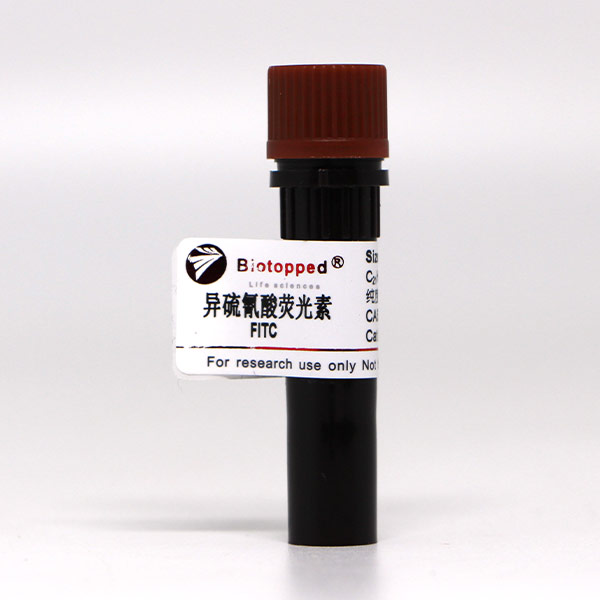 产品介绍: 异硫氰酸荧光素 FITC,英文全称 Fluorescein Isothiocyanate,是生物学中应用最为广泛的一种绿色荧光素衍生物。FITC 具有高吸收率、优良的荧光量子产率和良好的水溶性等特点。FITC 的异硫氰酸基团可与蛋白质上的氨基、巯基、咪唑、酪氨酰、羰基等基团相结合,从而实现包括抗体,凝集素在内的蛋白标记。FITC 除了用作蛋白质标记物,还可用 作蛋白质荧光示踪剂,通过标记抗体而快速鉴定病原体,或是用于蛋白质和多肽(HPLC)的微量测序。FITC 的最大激发波长为 494 nm。一旦激发,在最大发射波长 520 nm 处呈黄-绿色荧光。