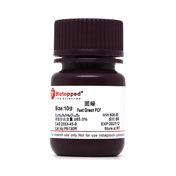 用途:本品仅供科研,不得用于其它用途。(以下用途仅供参考)植物组织学和细胞学的染色。是一种碱性染料,用于IEF、PAGE 和 SDS-PAGE中的蛋白质染色。快绿染色比亮蓝R(Brilliant Blue R )覆盖更宽范围的蛋白质浓度,是线性的。电泳过后,把蛋白质固定在胶上染色更加灵敏,在胶上用0.1%快绿溶于30% (v/v) 乙醇、10% (v/v) 醋酸或7% 醋酸染色2小时再用30% (v/v) 乙醇、10% (v/v) 乙酸或 7% 醋酸去染色. 染色胶能在625 nm浏览。检测灵敏度要比亮蓝R(Brilliant Blue R)高30%。另外,快绿还用于亚硫酸盐测定,制造细菌培养基,用以鉴别大肠杆菌及其他乳糖发酵菌,培养分离粪便中的伤寒杆菌