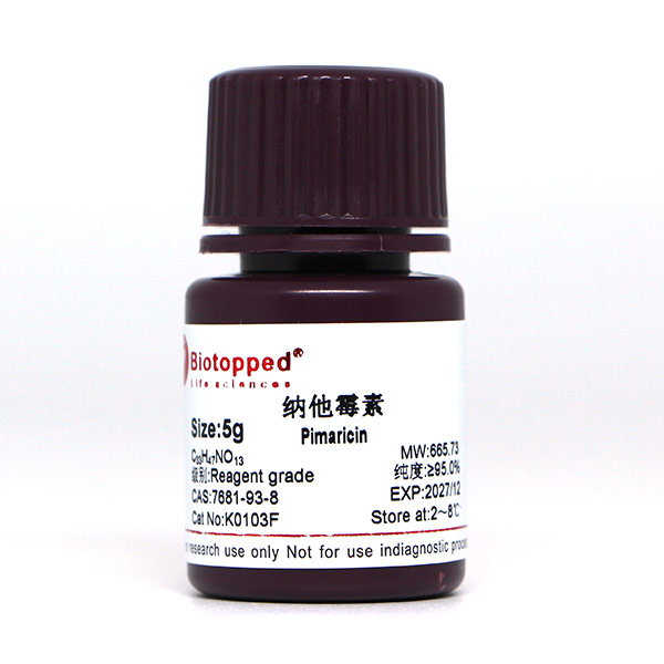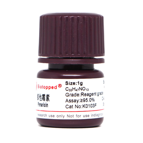 溶解性 近白色至奶油黄色结晶粉末,来源:游链霉菌(Streptomyas natalensis)。几乎无臭无味,可含3mol的水,几乎不溶于水,高级醇、醚、酯,微溶于甲醇,溶于冰醋酸和二甲苯亚砜。对氧化剂和紫外线较为敏感