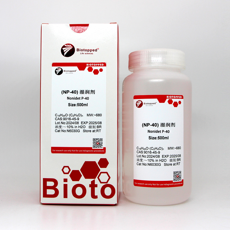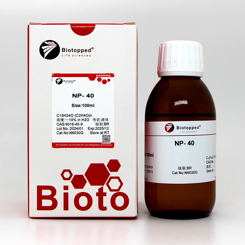 生物学应用:NP40是一种非离子型表面活性剂,是动物细胞常用的裂解液。在免疫沉淀中所用的抗体是识别构像的表位时使用NP40裂解液。如果抗体是识别线性抗原表位(如合成肽)则可使用强变性裂解液(如RIPA裂解液)。