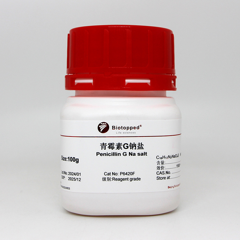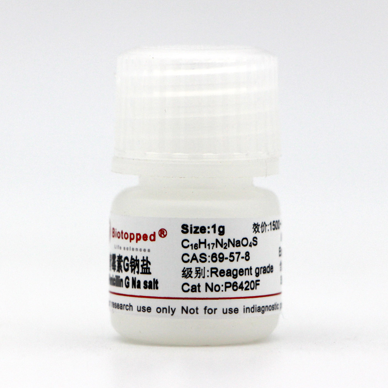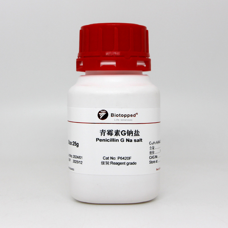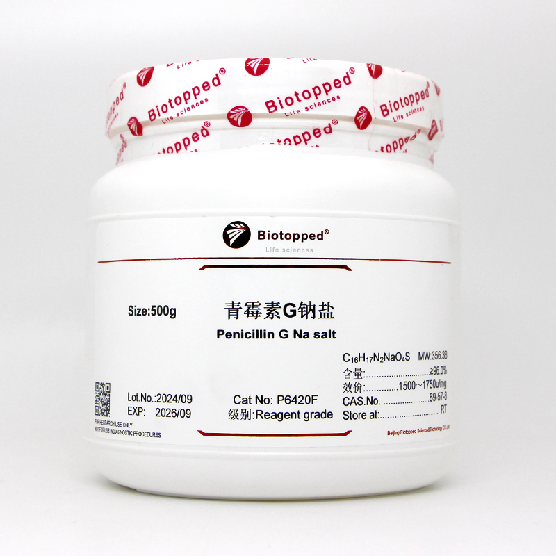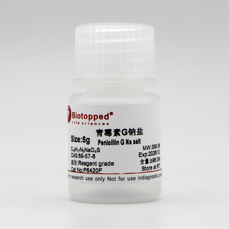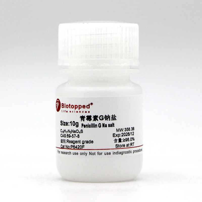 保存:RT,保质期2年。青霉素G钠溶液过滤灭菌后能在28℃储存一周, -20℃能保存更长时间,在37℃只能保存3