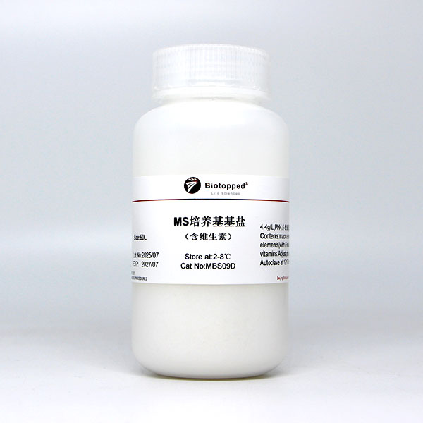 MS培养基是Murashige和Skoog于 1962 年为烟草细胞培养而设计的,简称为MS Medium。MS固体培养基(含Agar)用于诱导愈伤组织,也用于胚、茎段、茎尖及花药的培养,MS液体培养基主要用于细胞悬浮培养。目前,MS培养基是植物组织培养领域使用最普遍的培养基,较高的无机盐浓度,能够保证组织生长所需的矿质营养,还能加速愈伤组织的生长。一般情况下,不用无需添加氨基酸、酪蛋白水解物、酵母提取物和椰子汁等有机成分。由于其离子浓度高,在配制、贮存和除菌等过程中,即使有些成分略有损失,也不会影响离子间的平衡。