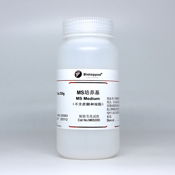 MS培养基是Murashige和Skoog于1962年为烟草细胞培养而设计的,简称为MS Medium。MS固体培养基(含Agar)用于诱导愈伤组织,也用于胚、茎段、茎尖及花药的培养,MS液体培养基主要用于细胞悬浮培养。目前,MS培养基是植物组织培养领域使用最普遍的培养基,较高的无机盐浓度,能够保证组织生长所需的矿质营养,还能加速愈伤组织的生长。一般情况下,不用无需添加氨基酸、酪蛋白水解物、酵母提取物和椰子汁等有机成分。由于其离子浓度高,在配制、贮存和除菌等过程中,即使有些成分略有损失,也不会影响离子间的平衡。