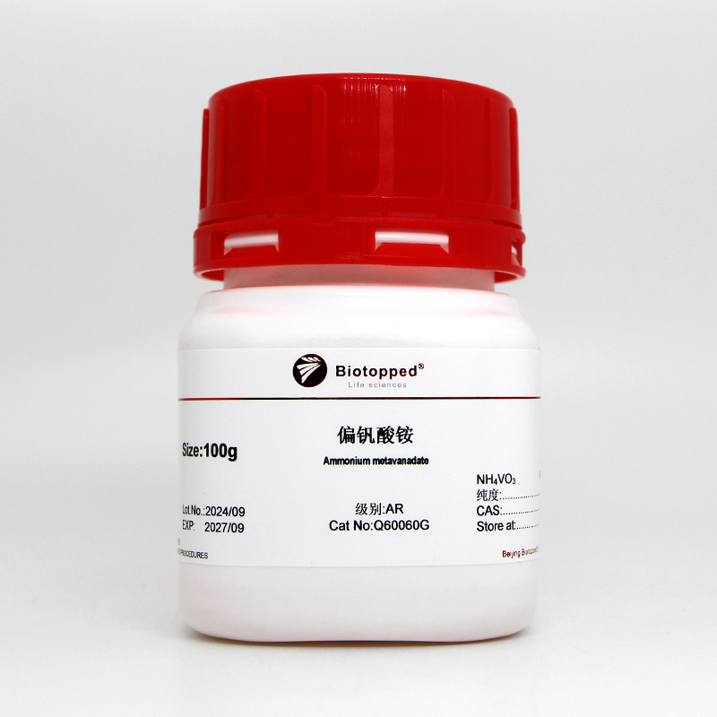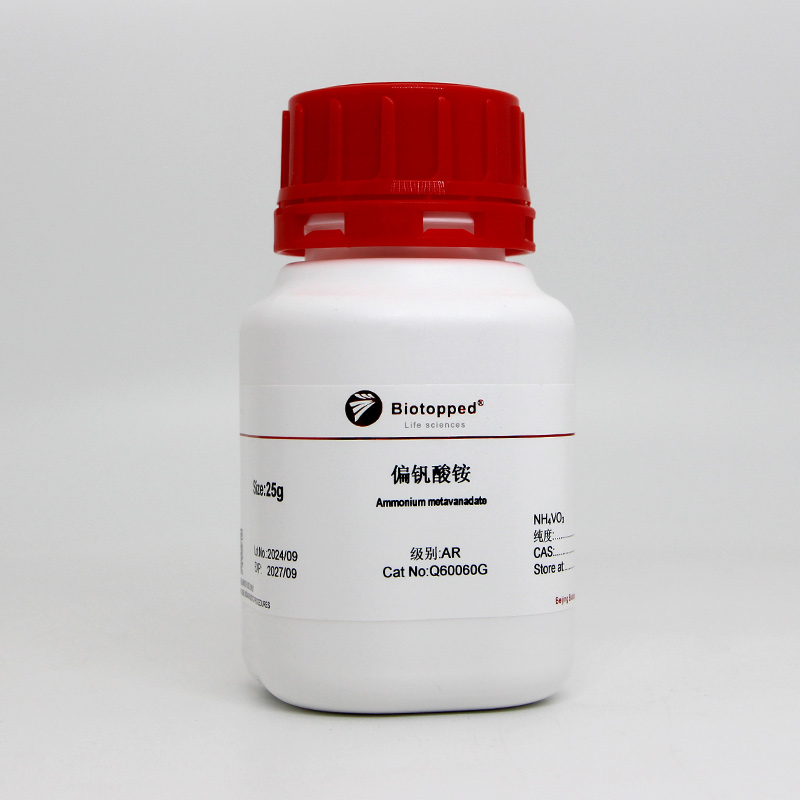 产品介绍: 介绍: 微溶于冷水、热乙醇和乙醚,溶于热水及稀氢氧化铵。能溶于165分水中。加热失去氨和水。空气中灼烧时变成五氧化二钒。有毒。
