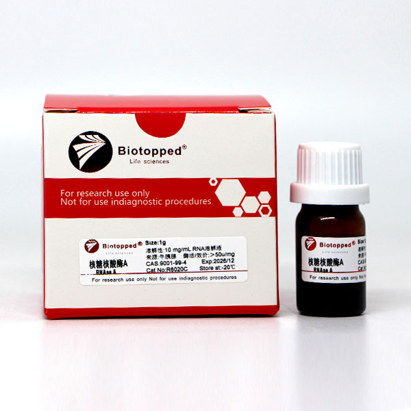 核糖核酸酶A是内切核糖核酸酶,可特异地攻击RNA上嘧啶残基的3'端,切割与相邻核苷酸形成的磷酸二酯键。反应终产物是嘧啶3'磷酸及末端带嘧啶3'磷酸的寡核苷酸。无辅因子及二价阳离子存在时,核糖核酸酶A的作用可被胎盘RNA酶抑制剂(B1ackburn et al.1977)或氧钒—核糖核苷复合物(Puskas et al.1982)所抑制。说明:生化研究;测定核酸的结构;核糖核酸(RNA)序列分析; 水解蛋白样品中的RNA;纯化DNA。