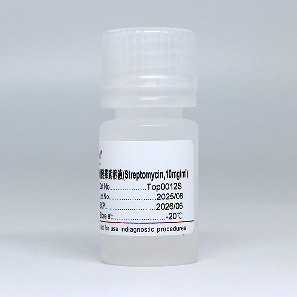 硫酸链霉素溶液 (Streptomycin,10mg/ml)由高纯度硫酸链霉素和去离子水配置而成的储存液,经无菌处理。使用时可以联合其他抗生素类药物一起加入到培养基中,一般工作浓度为 10~50ug/ml。本品仅用于科研,不用于临床诊断或其他用途。
