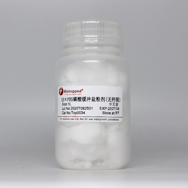 磷酸缓冲盐溶液(PBS,无钙镁)即 Phosphate-Buffered Saline,是最常用的磷酸盐缓冲溶液,又称 Dulbecco's 磷酸缓冲盐溶液、Dulbecco's PBS、D-PBSA、CMF-DPBS 或D-PBS、DPBS 溶液, 主要由氯化钠、氯化钾、磷酸盐等组成,不含 Ca2+ 、Mg 2+ ,pH 值一般为 7.2~7.4,常用于细胞培养过程中细胞的洗涤或其他常规用途。使用时,取粉末 充分溶解于1L 水即为 10×PBS,如要求无菌,应高压灭菌或过滤除菌。