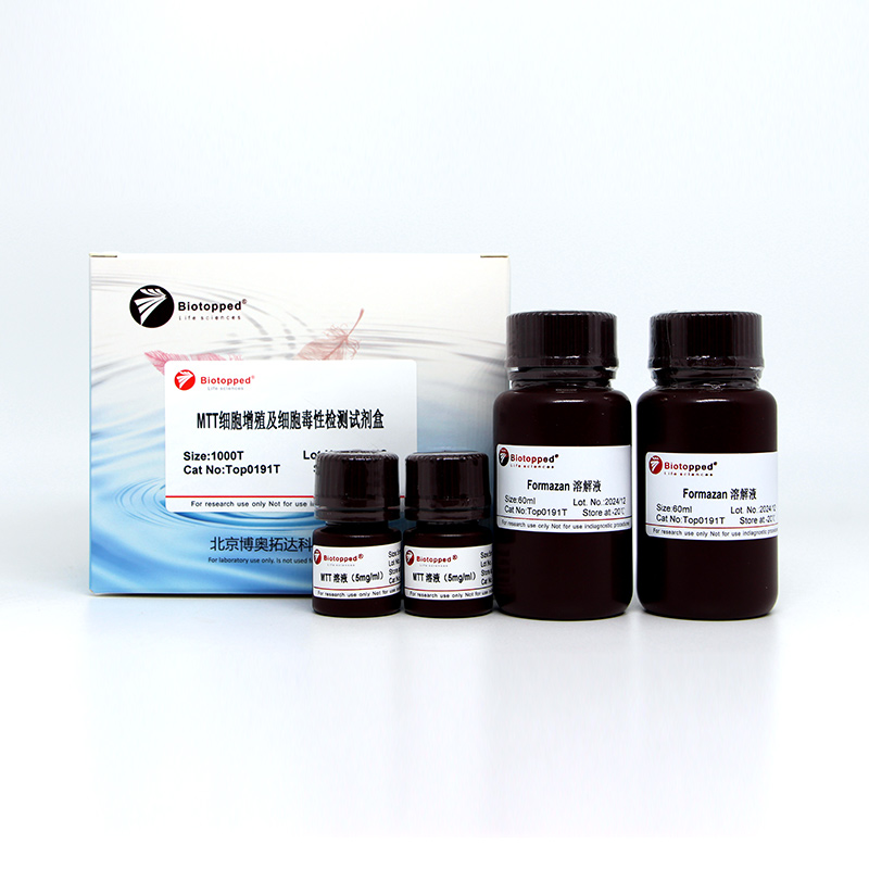 MTT比色法是一种检测细胞存活和生长的方法。MTT细胞增殖及细胞毒性检测试剂盒(MTT Cell Proliferation and Cytotoxicity Assay)被广泛应用于细胞增殖和细胞毒性的检测。MTT检测原理在于活细胞线粒体中的琥珀酸脱氢酶能使外源性MTT还原为水不溶性的蓝紫色Formazan并沉积在细胞中,而死细胞无此功能。在特定溶剂 (如DMSO)存在的情况下,可以被完全溶解。然后通过酶标仪可以测定570nm波长附近的吸光度。细胞增殖越多越快,则吸光度越高;细胞毒性越大,则吸光度越低。