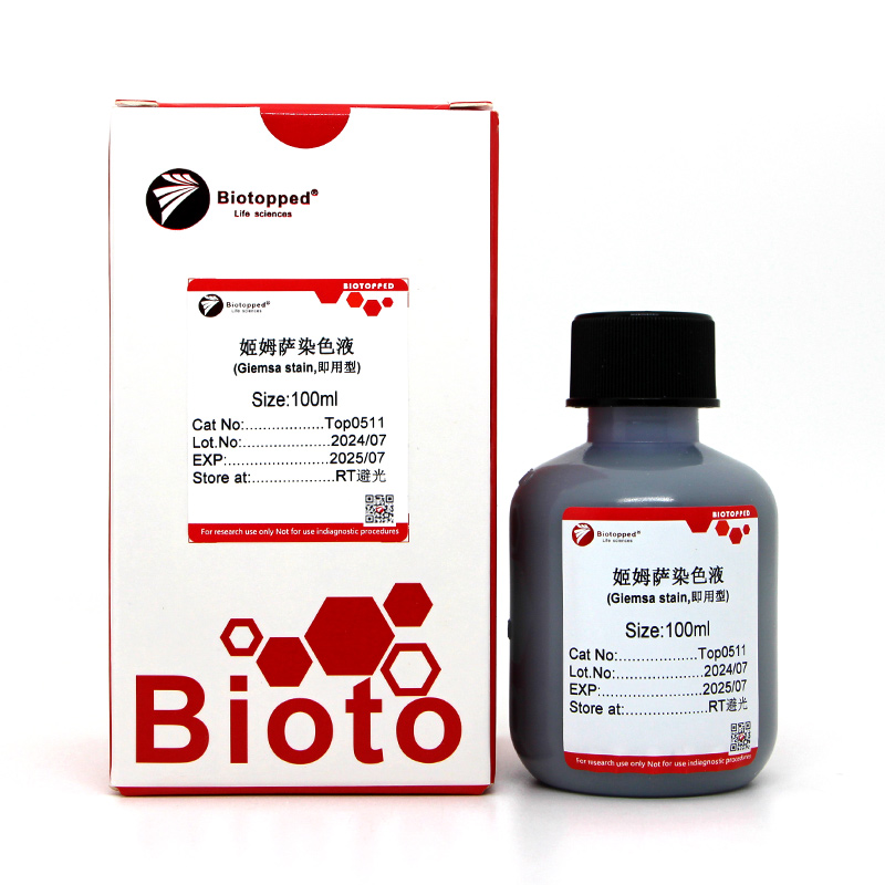 Giemsa Stain 以进口的姬姆萨色素、甲醇为主要原料,含特有衬染剂,经研磨配制而成,能呈现出清晰的细胞染色效果。经常用于组织切片、血液和细胞涂片、细菌、染色体显带、原生动物寄生虫等染色。嗜酸性颗粒为碱性蛋白质,与酸性染料伊红结合,染粉红色,称为嗜酸性物质;细胞核蛋白和淋巴细胞胞浆为酸性,与碱性染料美蓝或天青结合,染紫蓝色,称为嗜碱性物质;中性颗粒呈等电状态与伊红和美蓝均可结合,染淡紫色,称为中性物质。