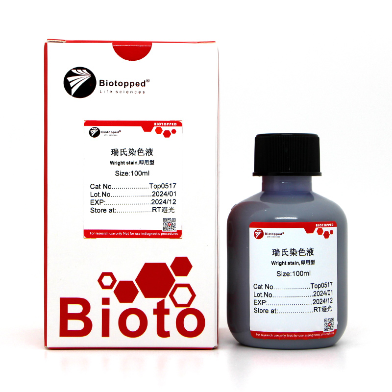 Wright Stain 以进口瑞氏色素为主要原料,通过研磨配制而成,能呈现出清晰的细胞染色效果。该染液的特点:由高浓度瑞氏色素、衬色剂组成,不含磷酸盐缓冲液,直接使用,染液中加微量中性甘油,防止甲醇挥发或氧化,同时也可使血细胞染色较清晰。经常用于血液和细胞涂片、骨髓细胞涂片、细菌染色。细胞质呈红色,细胞核及细菌呈蓝色,嗜酸性颗粒呈橘红色。