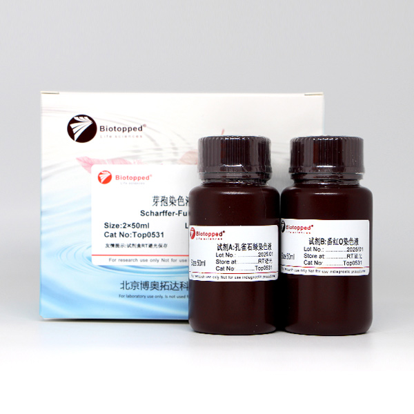 本试剂盒采用冷染法对芽孢进行染色,相对于热染法更安全也便于操作。染色后芽孢着绿色,细菌着红色,颜色清晰,对比明显,便于观察。但应注意,观察芽孢应在成熟期,但也不能过久,否则只能看到芽孢,而营养体已经消失。该染色液仅用于科研领域,不用于临床诊断或治疗。
