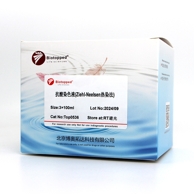 产品介绍: 分枝杆菌的细胞壁内含有大量脂质包围在肽聚糖的外面, 所以分枝杆菌一般不易着色。分枝杆菌中的分枝菌酸不染料一旦结合后,就很难被酸性脱色液脱色,故名抗酸染色。传统的染色方法要经过加热和延长染色时间来促使其着色,其中最具代表性的是结核杆菌Ziehl-Neelsen 染色法,该法是WHO 和中国结核病防治规划中推荐的热染方法。 抗酸染色液(Ziehl-Neelsen 热染法)属于热染色液,其染色原理是在加热条件下,分枝菌酸不复红结合成复合物,经亚甲蓝复染后,分枝杆菌仍然为红色,而其他细菌及背景中的物质为蓝色。该试剂盒更适用于冷染法效果不佳的情况。
