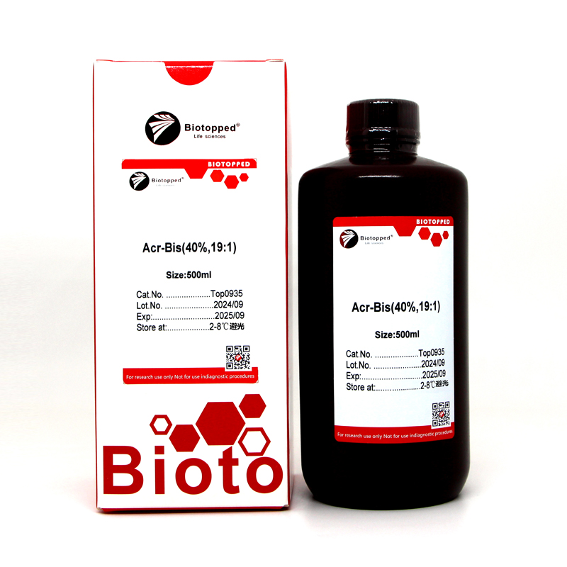 Acr-Bis(40%,19:1) 中 Acrylamide 和 Bisacrylamide 的比例为 19:1, 丙烯酰胺总量为40%,常用于配制丙烯酰胺凝胶(PAGE胶),包括SDS-PAGE 胶等,可以用于蛋白或核酸的分离,是实验室的常用储备液。