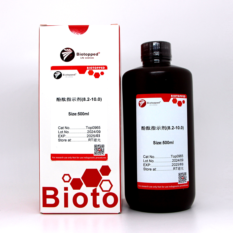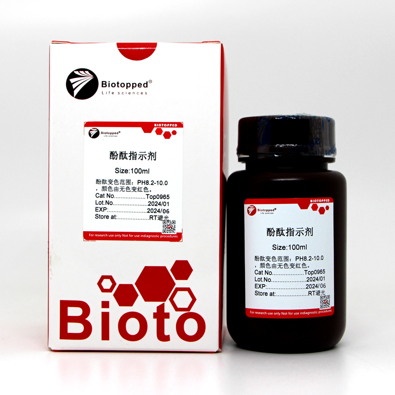 3.酚酞指示剂(8.2-10.0)由酚酞、乙醇、去离子水等组成,pH变色范围是为8.2(无色)~10.0(紫红色),所以酚酞只能检验碱而不能检验酸。本产品仅用于科研领域,不适用于临床诊断或其他用途。
