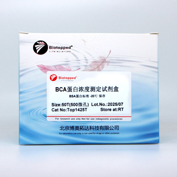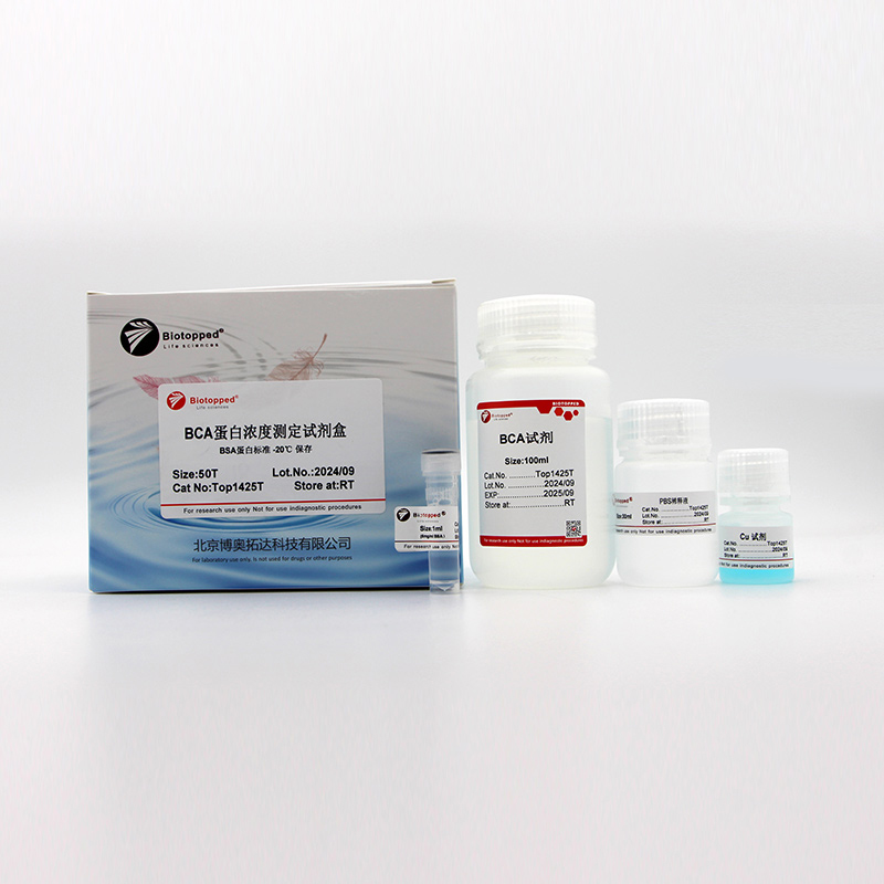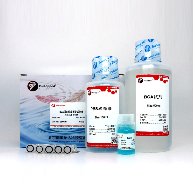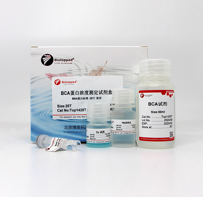 产品介绍: 碱性条件下,蛋白将Cu2+还原为Cu+,Cu+与BCA试剂形成紫蓝色的络合物,测定其在562nm处的吸收值,并与标准曲线对比,即可计算待测蛋白的浓度。常用浓度的去垢剂SDS,Triton X-100,Tween不影响检测结果,但受螯合剂(EDTA,EGTA)、还原剂(DTT,巯基乙醇)和脂类的影响。实验中,若发现样品稀释液或裂解液本身背景值较高,可试用Bradford蛋白浓度测定试剂盒。