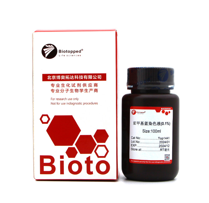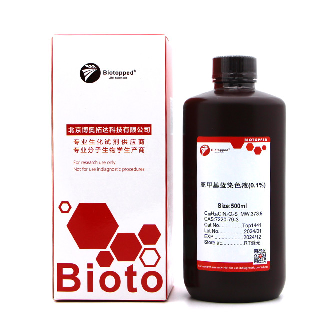 亚甲基蓝(Methylene blue)又称美蓝、次甲基蓝、次甲蓝等,是一种芳香杂环化合物。亚甲基蓝染色液常用于丝绸、纸张、细菌、细胞等染色。因其容易氧化,染色结果不宜长久保存。