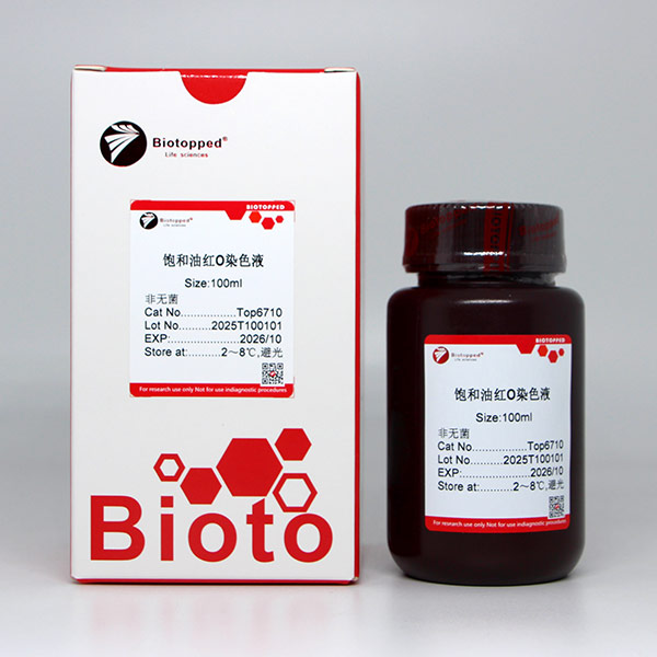 油性红O(Oil Red O)是一种脂溶性偶氮染料,是很强的脂溶剂和染脂剂,能特异性地使组织和细胞内中性甘油三脂、脂质以及脂蛋白等染色。当组织切片置入染液时,染料则离开染液而溶于组织内的脂质(如脂滴)中,使组织内的脂滴呈红色。用于分析细胞样品中脂质状况。本产品为饱和油红O染色液,操作简捷,性能稳定,着色清晰。