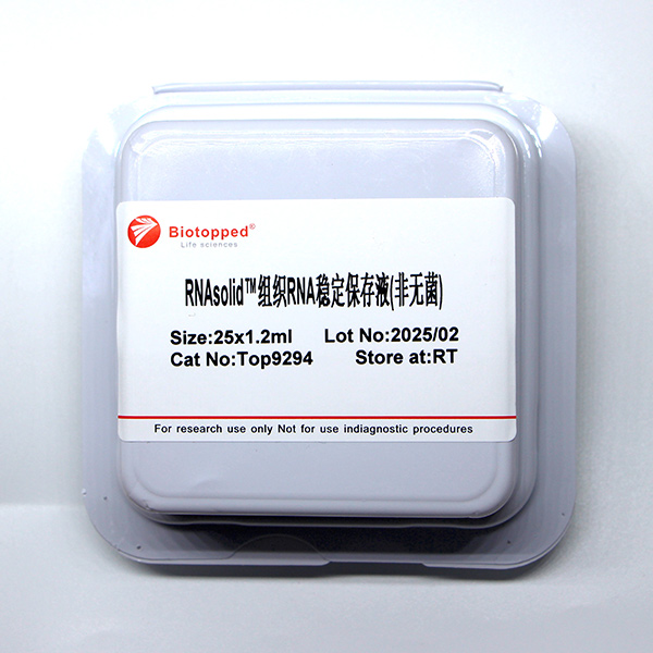 RNAsolidTM组织RNA稳定保存液常用于采集动物组织时,仅需室温操作,即可迅速抑制RNase并稳定保存组织样品中的RNA。本产品可广泛用于新鲜动物组织样品如肝脏、脑、肺、脾脏、肾脏、心脏、肌肉等以及某些植物样品的保存,适合样品收集后不能够立即进行RNA抽提(包括miRNA等小RNA)的情况,特别适用于野外采集的样品、大批量采集的动物组织样品和不能立即冻存样品的RNA稳定与保存。本产品的效果和液氮冻存的效果相当。本产品可以迅速渗透到组织内部,完全抑制内源性RNase活性,避免RNA降解,保持样本中RNA的完整性,并且和液氮一样可长期保存样品中的RNA。本产品安全便捷,无任何毒性和刺激性,可室温使用,确保了使用时的安全和便捷,与使用液氮相比,可有效避免因使用超低温的液氮而引起的冻伤、离心管爆裂等安全隐患,并且携带、运输非常方便。在本产品中样品的保存时间和存储温度相关,例如37℃可保存1~2天,室温25℃可保存一周,4℃可以保存1个月,-20℃或更低温度可以长期保存。